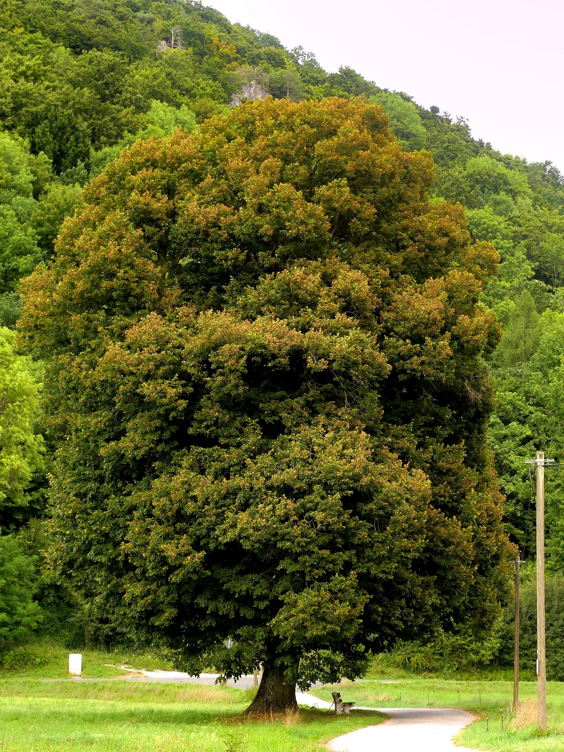 Auf der Bank unter der mächtigen Linde bei Haag kann man bestimmt auch längere Regenschauer trocken überstehen.