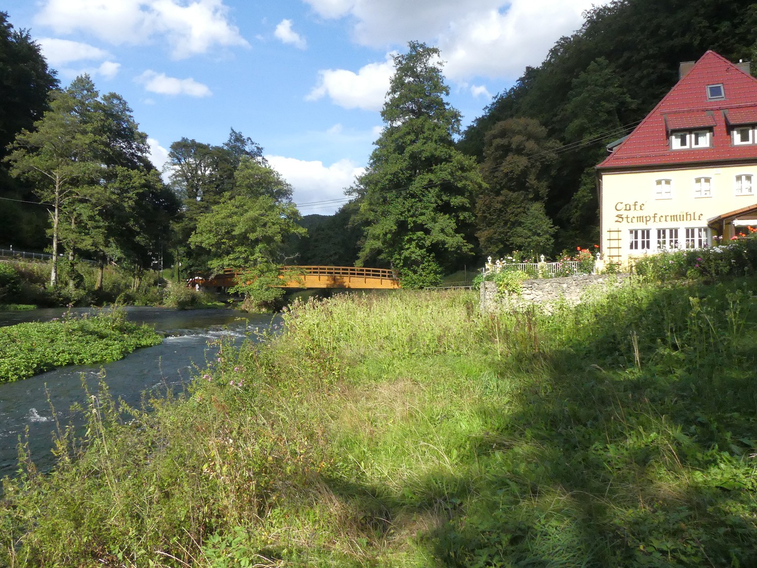 Die Wiesent hat es von hier nicht mehr weit bis zu ihrer Quelle in Steinfeld. Alte Wehranlagen dienten wahrscheinlich nicht einer Mühle, sondern der Bewässerung der Wiesen. Auf dem wasserdurchlässigen Kalkstein trocknet der Erdboden schnell aus, und da es früher keine Kläranlagen gab, sorgte das Wasser des Baches sicher auch für Düngung. Heute wird nicht mehr bewässert, denn trockene Magerwiesen besitzen eine besondere Pflanzenvielfalt mit Wildblumen, die in jeder Jahreszeit andere Farbakzente setzen.